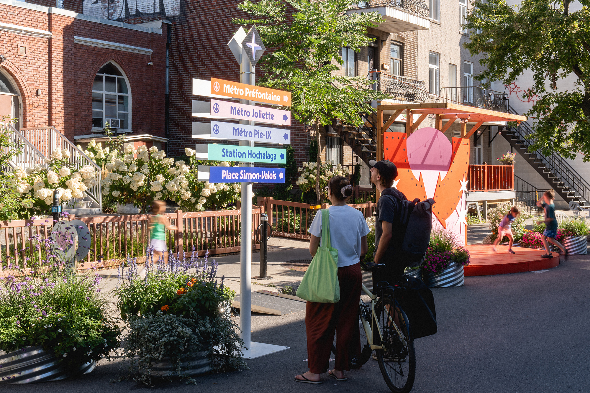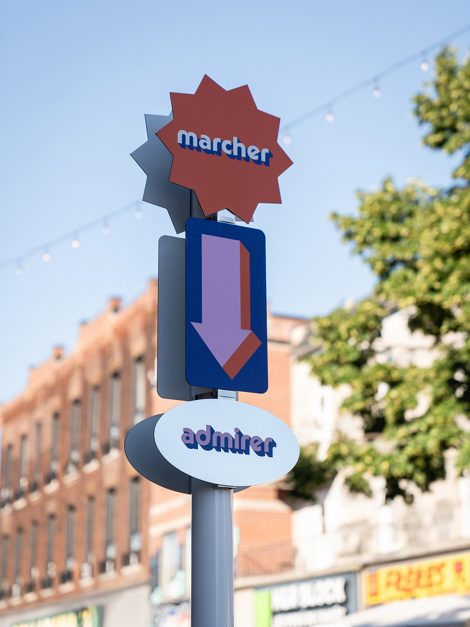 Thanks to the work of the SDC Hochelaga-Maisonneuve, the street is bustling all summer long. To support the cultural programming, stages are set up at key locations along the street and decorated to reflect the street's atmosphere. Their shapes, enhanced with small circular mirrors—a nod to stage lights and the festive atmosphere of outdoor performances— recall the oversized roadside signs of past road trips.