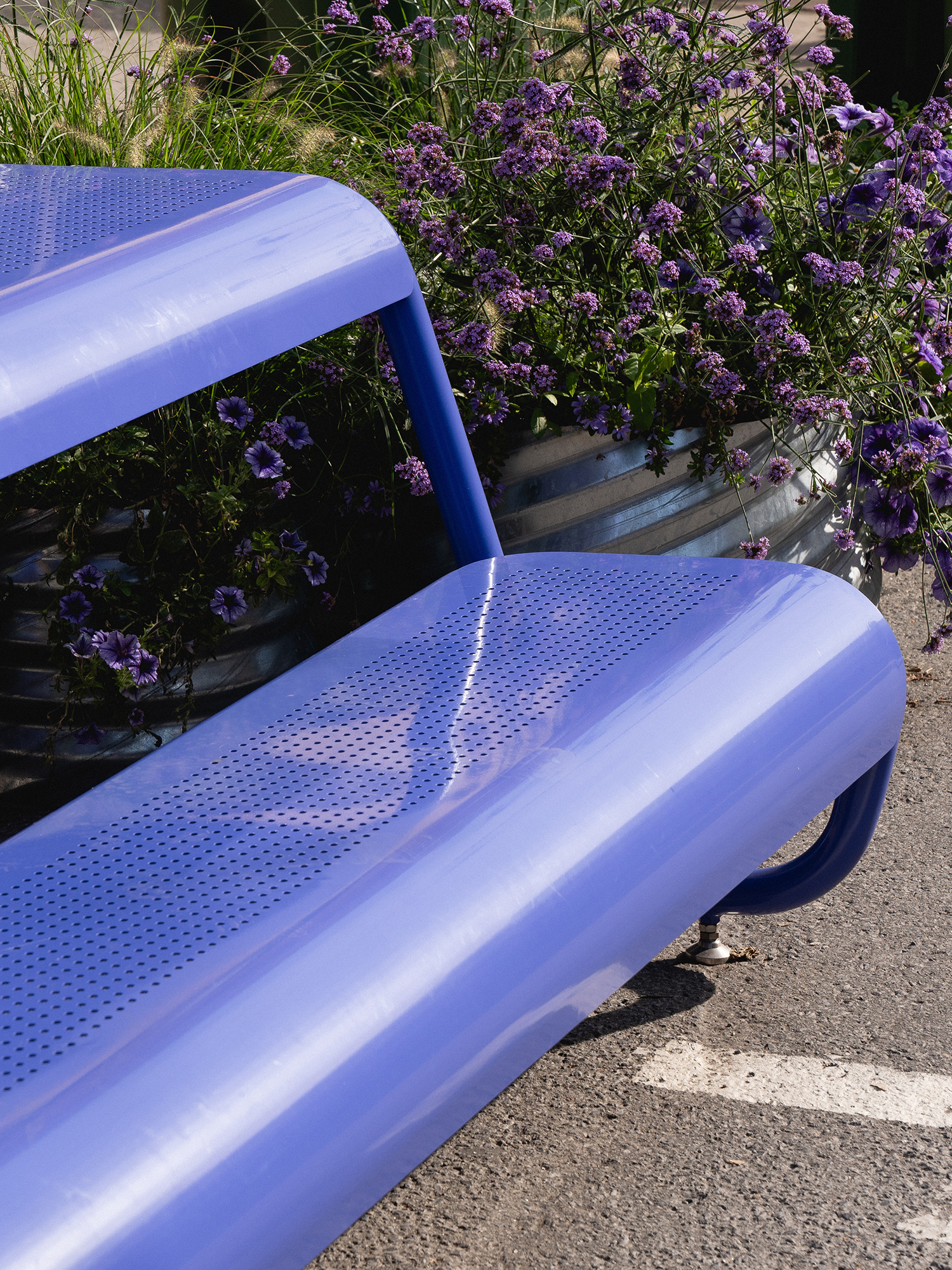 New this year, PXP designed signature street furniture: a multifunctional, accessible table-bench with soft curves and the project’s signature color. Sets of tables and shade structures are spread along the street, complementing the commercial offering and encouraging conviviality.